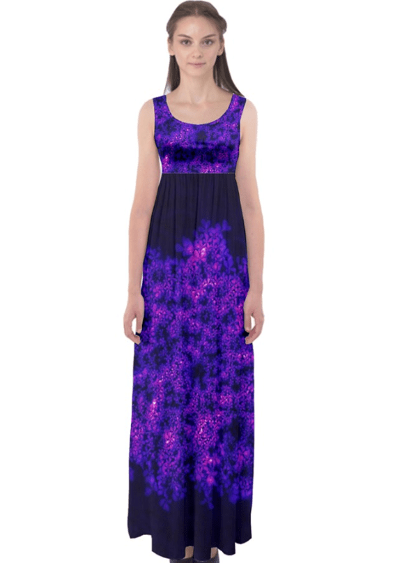 “Queen Anne’s Lace in Blue and Purple” as an empire waist maxi dress on CowCow