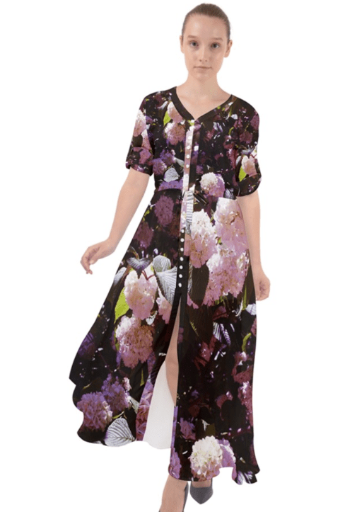 “Purple Snowballs” as a button-up maxi dress on CowCow