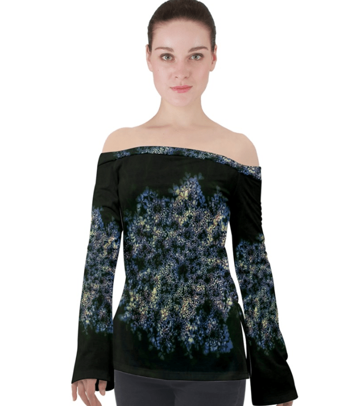 “Queen Anne’s Lace in Blue and Yellow” as an off-shoulder shirt on CowCow